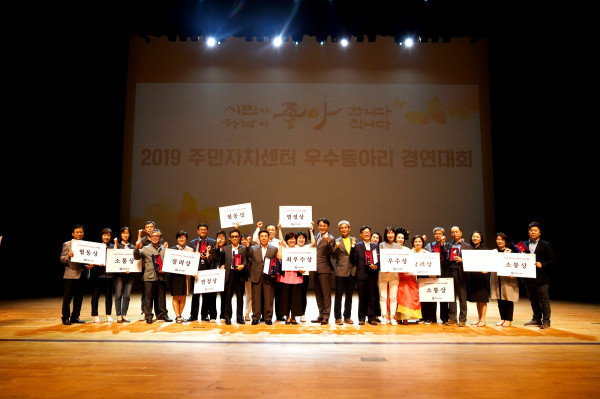 경기 하남시는 최근 하남문화예술회관 검단홀에서 ‘2019년 주민자치센터 우수동아리 경연대회’를 개최했다. 이번 대회의 최우수상은 덕풍1동 다이어트 댄스팀이 차지했다. 사진은 이날 김상호 시장과 수상팀들이 기념촬영을 하는 모습. (사진제공=하남시청)