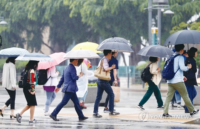 비가 내리는 27일 오전 서울 세종로사거리에서 시민들이 우산을 쓴 채 길을 걷고 있다.