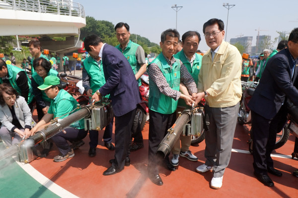 서울 동대문구는 최근 중랑천 제2체육공원에서 유덕열 구청장 및 새마을방역봉사대 등 150여명이 참석한 가운데 ‘2019 새마을방역봉사대 발진식’을 개최했다. 사진은 유 구청장(오른쪽)이 봉사단원과 함께 방역기를 시운전하는 모습. (사진제공=동대문구청)