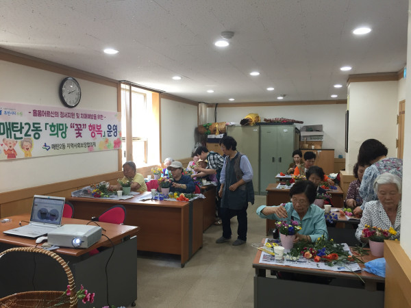 최근 경기 수원시 영통구 매탄2동지역사회보장협의체는 행정복지센터에서 홀몸노인 12명에게 정서 지원을 위한 '희망 꽃 행복' 프로그램을 운영했다. 사진은 참여자들이 카네이션, 장미, 국화를 소재로 '꽃 컵케이크'를 만들고 있는 모습. (사진제공=수원시청)