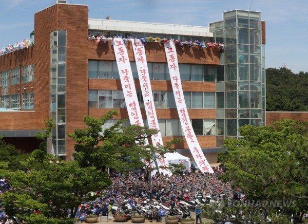 28일 오전 울산시 동구 한마음회관 앞에서 집회를 연 현대중공업 노조가 구호를 외치고 있다. 노조는 지난 27일부터 주주총회 장소인 한마음회관을 점거해 농성하고 있다.