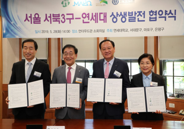 유동균 마포구청장은 28일 열린 ‘서북3구(서대문·마포·은평)와 연세대의 상생발전을 위한 협약식’에 참석했다. 사진은 유동균 구청장(오른쪽 두 번째)과 은평·서대문 구청장 및 연세대 총장이 기념촬영을 하는 모습. (사진제공=마포구청)