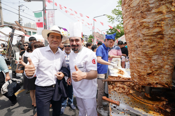 서울 성북구가 최근 성북로 일대에서 '제11회 성북세계음식축제 누리마실'을 개최했다. 이번 행사는 시민 5만여명이 참여해 39개국 요리와 문화체험 및 마켓 등이 펼쳐졌다. 사진은 이승로 구청장(오른쪽)과 행사관계자의 기념촬영 모습. (사진제공=성북구청)