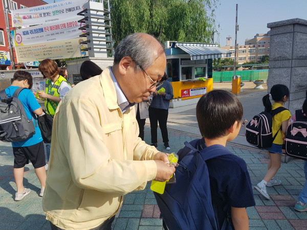 인천 동구는 29일 서림초등학교에서 녹색교통봉사대와 함께 등교하는 학생의 가방에 직접 열쇠고리형 교통안전용품인 옐로카드를 달아주는 교통안전 캠페인을 실시했다. 사진은 교문 앞에서 초등학생의 가방에 옐로카드를 달아주는 모습. (사진제공=인천동구청)