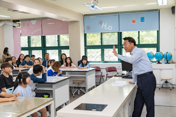 김선갑 서울 광진구청장이 28일 화양초등학교 '일일교사'로 나섰다. 이번 일일교사는 지난 1월 화양동 업무보고회 당시 화양초등학교에 재학 중인 이안나 학생이 요청해 약속을 지키기 위해 마련됐다. 사진은 김 구청장이 학생들과 장래희망에 대한 대화를 나누는 모습. (사진제공=광진구청)