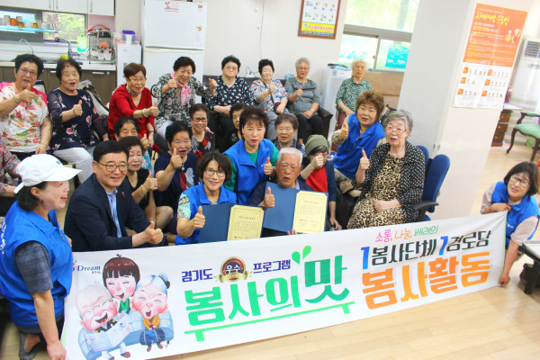 경기 동두천시 자원봉사센터 봉사단체인 '우정봉사회'는 28일 휴먼시아아파트 경로당을 방문해 경기도 우수 프로그램 ‘1봉사단체 1경로당 결연 봉사활동’을 진행하고 노인들에게 떡과 과일을 대접했다. 사진은 노인들과 함께 기념촬영을 하는 모습. (사진제공=동두천시청)