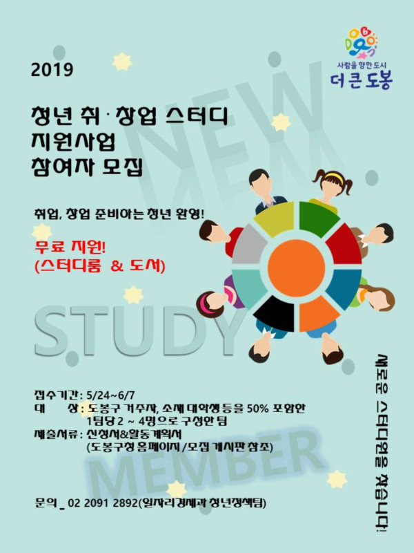 [시민일보=황혜빈 기자] 서울 도봉구(구청장 이동진)는 취업 준비생들에게 가장 부담스러운 비용으로 꼽히는 취업준비 비용 절감을 위해 ‘청년 취·창업 스터디 지원사업’을 진행한다.