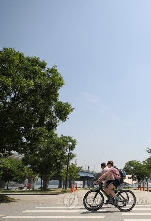 맑고 쾌청한 날씨를 보인 29일 오전 서울 여의도 한강공원에서 외국인들이 자전거를 타고 있다.