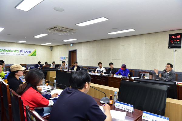 경기 여주시는 지난 28일 시청 상황실에서 이항진 시장과 청년농업경영인 18명이 참석한 가운데 ‘2019년 청년농업경영인 2차 간담회’를 열고 청년들의 창업 지원 및 교육지원 방향 등에 대해 논의했다. 사진은 이 시장(오른쪽)이 발언하는 모습. (사진제공=여주시청)