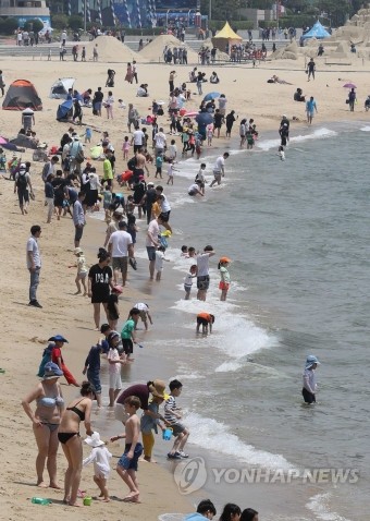 일요일인 2일 부산 해운대해수욕장을 찾은 나들이객들이 해변에서 더위를 식히고 있다. 부산 해운대·송정·송도해수욕장은 1일 개장해 8월 31일까지 운영한다.