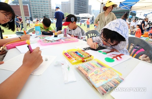 2일 오전 서울광장에서 열린 '치유의 도시 서울! 걷기 명상'에서 임시정부수립 100주년 기념백일장에 참가한 어린이들이 그림 그리기와 글짓기를 하고 있다.