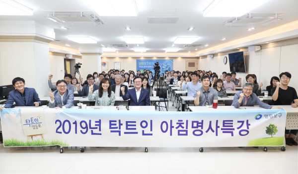 서울 영등포구는 최근 구청 기획상황실에서 ‘탁트인 아침명사특강’을 개최했다. 이날 강사로 나선 은유 작가는 ‘이해와 공감의 글쓰기’라는 주제로 강의했다. 사진은 채현일 구청장(앞줄 가운데)과 직원들이 기념촬영을 하는 모습. (사진제공=영등포구청)
