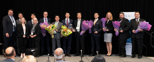 | ▲ 이종환 한전 기술혁신본부장(우측에서 5번째)이 다른 수상자들과 함께 기념촬영하는 모습 | ||