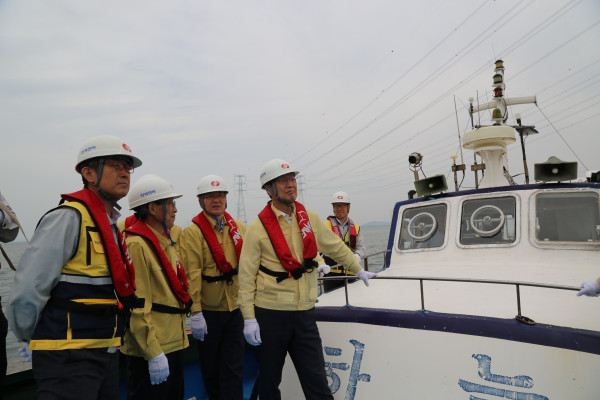 | ▲ 김종갑 사장(왼쪽에서 네번째)이 345kV 영흥 해상송전철탑을 점검하는 모습.(사진제공=한전) | ||
