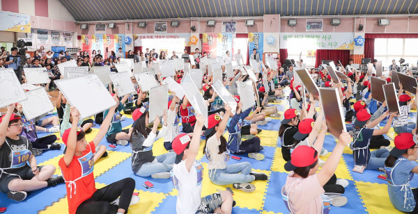 인천 서구는 최근 검암초등학교 강당에서 서바이벌 영어퀴즈 대회인 ‘제13회 비바 잉글리쉬 골든벨 대회’를 성황리에 개최했다. 이날 총 20명의 수상자에게 트로피와 상장이 수여됐다. 사진은 학생들이 정답을 적은 화이트보드를 들고 있는 모습. (사진제공=인천서구청)
