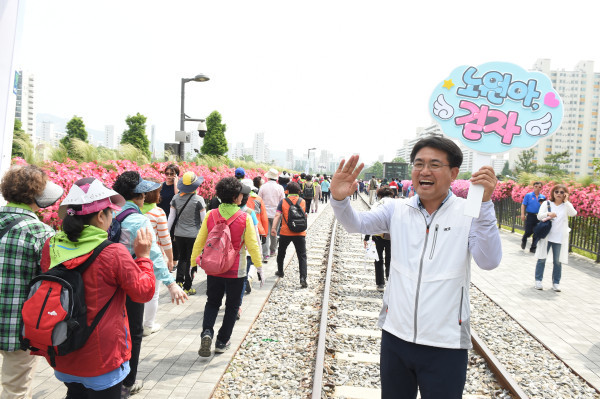 오승록 노원구청장은 최근 노원구 체육회가 주최하고 19개 동 체육회가 주관한 ‘경춘선 숲길 구민 건강걷기 대회’에 참석해 녹천중학교~화랑대 철도공원 약 4km구간을 걸었다. 사진은 오 구청장이 대회에 참가한 주민들에게 인사하는 모습. (사진제공=노원구청)