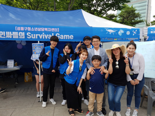 서울 성동구는 최근 왕십리광장에서 청소년을 대상으로 미래사회에 각광받을 직업에 대해 체험하며 진로 탐색에 도움을 주고자 청소년 미래진로축제 ‘퓨처페스티벌’을 개최했다. 사진은 정원오 구청장과 청소년들이 기념촬영을 하는 모습. (사진제공=성동구청)