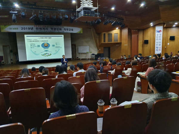 경기 남양주시는 최근 다산홀에서 직원 100여명을 대상으로 민원처리의 체계적 이해와 고충민원의 대응기법을 향상하고자 국민권익위원회 전문위원을 초빙해 ‘2019년 민원처리 역량강화 직무교육’을 실시했다. 사진은 교육이 진행되고 있는 모습. (사진제공=남양주시청)
