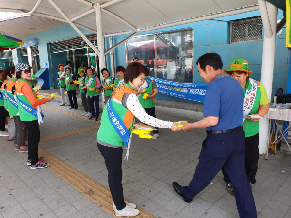 경기 양주시는 4일 양주역 일대에서 시 자율방재단과 함께 '여름철 자연재난 예방 캠페인'을 실시했다. 이날 캠페인은 ▲폭염특보시 행동요령 ▲물놀이 안전수칙 ▲풍수해보험 가입 등을 홍보했다. 사진은 시민에게 홍보물품을 나눠주는 모습. (사진제공=양주시청)