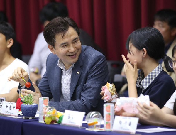경기 화성시는 4일 나래울종합사회복지관에서 '시장님과 함께 하는 청소년 간담회’를 개최했다. 이날 간담회에는 서철모 시장이 참석해 센터 청소년들과 소통하는 시간을 가졌다. 사진은 간식을 먹으며 대화를 나누는 서 시장(왼쪽)과 학생의 모습. (사진제공=화성시청)