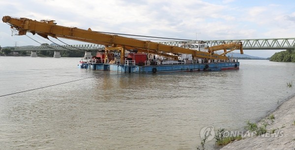 헝가리 부다페스트 다뉴브강에서 침몰한 허블레아니호 인양에 투입되는 대형 크레인 '클라크 아담'이 5일(현지시간) 침몰현장에서 5.5km 정도 떨어진 헝가리 부다페스트 다뉴브강 우이페쉬트 선착장에 정박하고 있다.