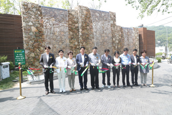 서울 관악구가 최근 관악산공원 입구에 조성된 테마정원 준공식을 개최했다. 테마정원에는 벽천분수, 힐링쉼터, 커뮤니티 광장 등이 조성됐다. 사진은 준공식에 참석한 박준희 구청장(왼쪽 네 번째)이 내빈들과 벽천분수 앞에서 테이프커팅식을 진행하는 모습. (사진제공=관악구청)