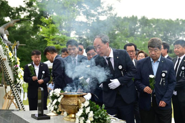 경기 여주시는 최근 현충일을 맞이해 상동 영월근린공원 현충탑에서 '제64회 현충일 추념식'을 개최했다. 이날 행사는 이항진 시장을 비롯해 국가유공자 및 유족, 군인, 공직자 등 관계자 300여명이 참석했다. 사진은 공직자들이 헌화하는 모습. (사진제공=여주시청)