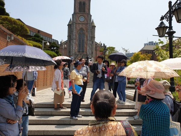 경기 부천시립상동도서관은 최근 '꽃보다 청춘 문학원정대' 3기 회원들과 명동과 청계천 일대 문학탐방을 다녀왔다. 이날 탐방은 방민호 서울대 교수의 설명을 통해 서울 속에서 문학을 배우는 시간을 가졌다. 사진은 명동성당 일대를 둘러보며 설명을 듣는 원정대의 모습. (사진제공=부천시청)