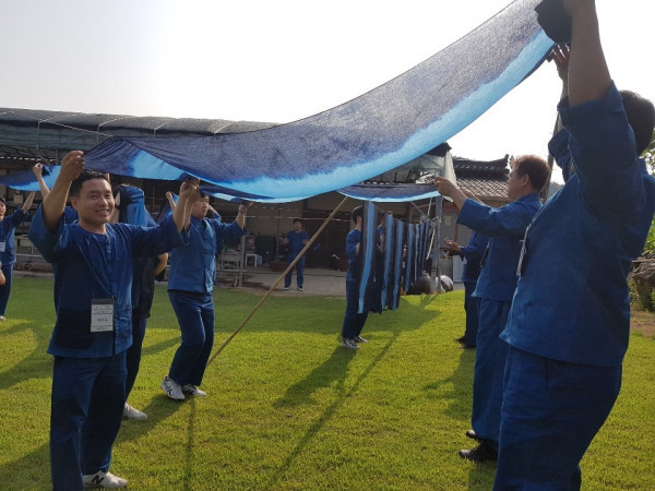 전남 나주시가 최근 문평면 명하쪽빛마을에서 충남 대전시 소방공무원 20명을 초청해 1박2일 농촌치유프로그램을 운영했다. 이번 행사는 소방관의 스트레스 및 트라우마 해소를 위해 다양한 프로그램이 진행됐다. 사진은 소방관들이 스카프 염색체험 하는 모습. (사진제공=나주시청)