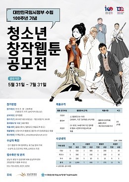 성남시 ‘3.1운동 및 임시정부 수립 및 100주년 기념 독립운동가 웹툰 프로젝트’의 연계 행사로 진행하는 이번 청소년 웹툰 공모전은 <대한민국임시정부 수립 100주년, 그 위대한 역사>를 주제로, 대한민국 수립의 단초가 된 임시정부 수립 100주년의 의미와 독립운동 정신을 강조하는 창작물이면 자유롭게 응모할 수 있다.