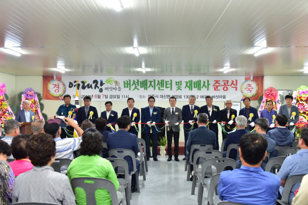 경기 여주시는 최근 대신면 장풍2리 마을에서 분뇨처리시설 주변 지역 지원사업으로 조성된 여대장 버섯마을 ‘버섯배지 센터 및 재배사’ 준공식을 개최했다. 사진은 이날 준공식에서 이항진 시장과 센터 관계자들이 테이프 커팅식을 진행하는 모습. (사진제공=여주시청)