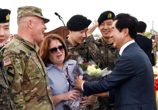 안병용 경기 의정부시장은 최근 평택 캠프 험프리스 미군기지에서 개최된 미8군 창설 75주년 기념행사 개회식에 참석했다. 사진은 안 시장이 이날 행사를 주최한 마이클 빌스 미8군 사령관과 인사를 나누고 꽃다발을 전달하는 모습. (사진제공=의정부시청)