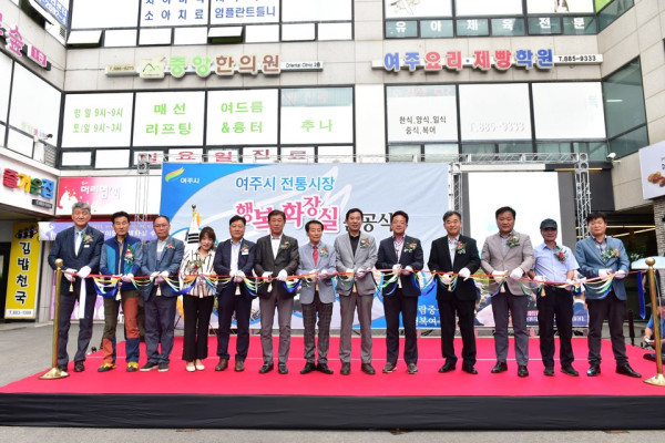 경기 여주시가 10일 문화의 거리에서 전통시장 활성화를 위한 '행복화장실 준공식'을 개최했다. 이날 행사에서는 시장을 찾는 방문객에게 보다 편리하고 청결한 화장실 운영과 이용에 대해 홍보했다. 사진은 관계자들의 테이프 커팅식 모습. (사진제공=여주시청)
