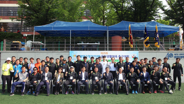 경기 수원시 팔달구는 지난 9일 아주대학교 축구장에서 2019년도 팔달구청장기 생활체육 축구대회를 개최했다. 사진은 이훈성 구청장 및 대회 참여자들이 기념촬영을 하는 모습. (사진제공=수원시청)