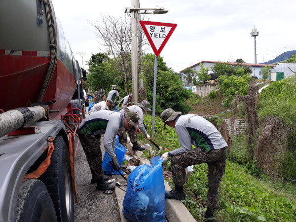 경기 남양주시 와부·조안행정복지센터는 10일 덕소천에서 8059부대와 함께 하천변에 방치된 폐기물을 수거하고 쾌적한 생활환경을 조성하기 위한 '하천 정화활동'을 전개했다. 사진은 부대원들이 하천변에서 쓰레기를 수거하고 있는 모습. (사진제공=남양주시청)