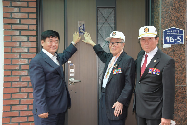 경기 동두천시는 10일 대한민국 6.25참전 무공수훈자인 하종식씨(86)의 자택에 국가유공자 명패를 달아줬다. 하씨는 1951년 김일성고지 전투 등에서 혁혁한 공을 세워 충무무공훈장을 수여받았다. 사진은 최용덕 시장이 하씨와 기념촬영을 하는 모습. (사진제공=동두천시청)