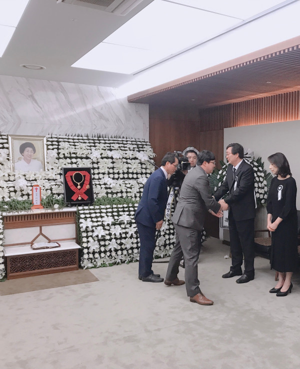 11일 이관수 서울 강남구의장과 복진경 의원이 서대문구 신촌 세브란스병원 장례식장에 마련된 고(故) 이희호 여사의 빈소를 찾아 조문을 했다. 사진은 상주와 악수를 하고 있는 이 의장(왼쪽에서 두 번째)의 모습. (사진제공=강남구의회)