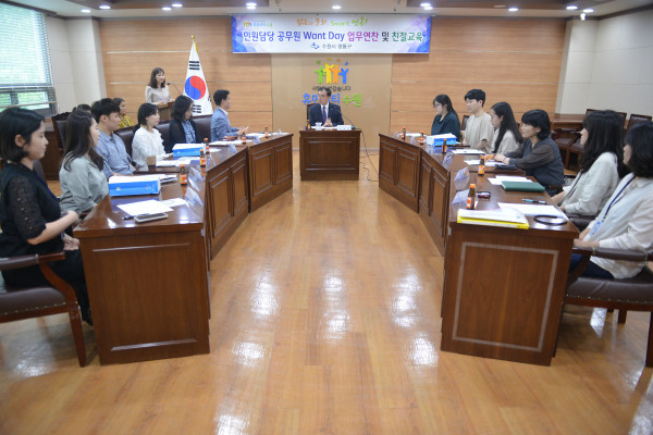 경기 수원시 영통구는 11일 구청 상황실에서 고객중심의 민원서비스를 제공하기 위해 민원담담 공무원을 대상으로 업무연찬을 실시했다. 이 날 업무연찬은 퀴즈를 이용해 민원업무에 대한 흥미 유도 및 스트레스를 해소하는 퀴즈(QUIZ) 데이라는 주제로 열렸다. 사진은 송영완 구청장이 관계자들과 이야기를 나누는 모습. (사진제공=수원시청)
