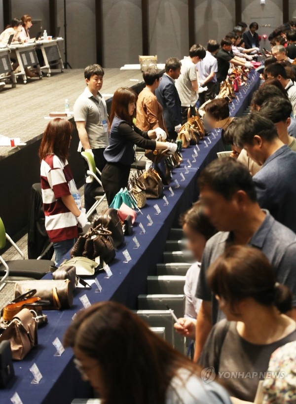 12일 오전 경기 수원시 영통구 수원컨벤션센터에서 열린 '경기도 지방세 체납자 압류 동산 공매'에서 참가자들이 명품 가방 등 공매 물품을 살펴보고 있다.