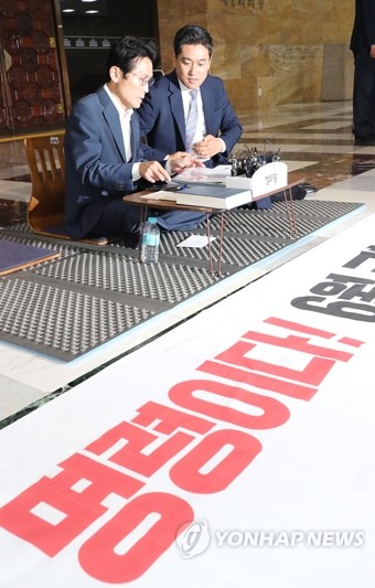 바른미래당 오신환 원내대표(오른쪽)가 13일 오전 국회 개원을 요구하며 본회의장 앞에서 농성 중인 정의당 윤소하 원내대표를 방문해 대화하고 있다.