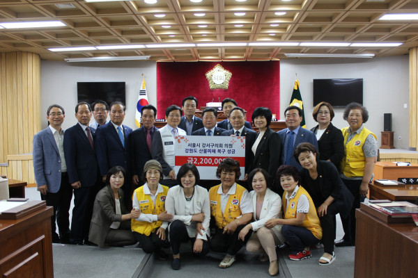 서울 강서구의회는 최근 5층 본회의장에서 지난 4월 발생한 강원도 산불 피해로 어려움을 겪고 있는 이재민들을 위해 대한적십자사에 성금 220만원을 전달했다. 사진은 김병진 의장과 구의원들이 대한적십자사 관계자들과 기념촬영을 하는 모습. (사진제공=강서구의회)