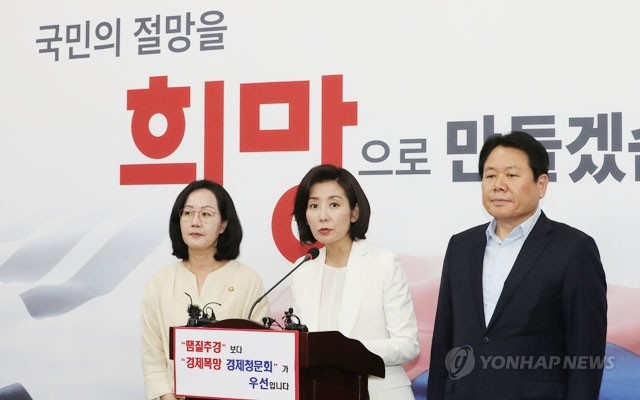 자유한국당 나경원 원내대표가 16일 오전 국회에서 대국민호소문을 발표하고 있다. 왼쪽부터 김현아 원내대변인, 나 원내대표, 정양석 원내수석부대표.