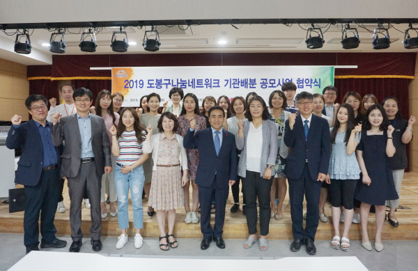 서울 도봉구 사회복지협의회가 최근 장애인종합복지관에서 ‘2019 도봉구 나눔 네트워크 기관 배분 사업’을 시행할 16개 기관과 협약을 체결하고 지원금 총 4100만원을 전달했다. 사진은 협약식에서 기관 관계자들이 기념촬영을 하는 모습. (사진제공=도봉구청)
