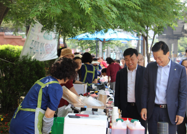 서울 성북구가 최근 돈암1동 통장협의회 주관으로 길음역 부근에서 나눔문화 확산을 위한 '주민과 함께하는 따뜻한 정 나누기 녹색장터'를 개최했다. 사진은 이날 녹색장터에 참여한 이승로 구청장(오른쪽)이 행사 관계자들과 인사를 나누는 모습. (사진제공=성북구청)