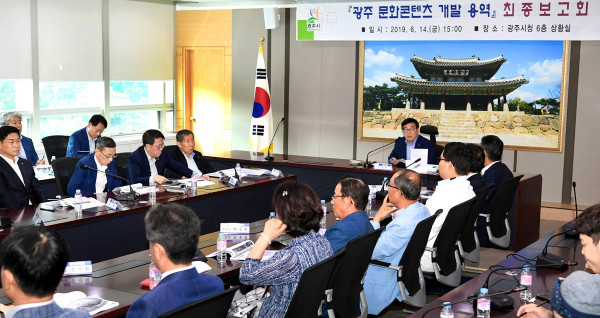 경기 광주시는 최근 시청 상황실에서 '광주문화콘텐츠 개발 용역 최종보고회'를 개최했다. 이날 회의에는 신동헌 시장, 이창희 문화원장, 이상오 예총회장과 관계자 등이 참석해 시가 개발하는 문화콘텐츠에 대해 논의했다. 사진은 회의 진행 모습. (사진제공=광주시청)