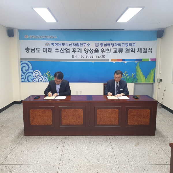 충남도 수산자원연구소는 18일 지역내 전문수산인력을 양성하고 지역 수산업 발전을 위해 충남해양과학고등학교와 미래 수산업 후계 양성을 위한 교류협약을 체결했다. 사진은 이날 열린 협약식에서 협약을 체결한 후 기념촬영을 하는 모습. (사진제공=충남도청)