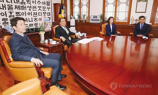 문희상 국회의장과 여야 교섭단체 원내대표들이 18일 여의도 국회 의장실에서 회동을 하고 있다. 왼쪽부터 더불어민주당 이인영 원내대표, 문 의장, 자유한국당 나경원 원내대표, 바른미래당 오신환 원내대표.