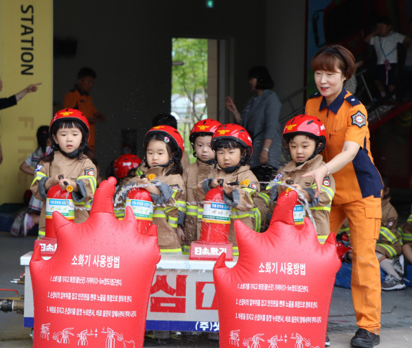 인천송도소방서는 18일 소방서 차고 앞에서 신광초등학교 어린이집 등 3곳 원생 50여명을 대상으로 이동안전체험차량을 활용해 동영상 시청, 소화기 체험 등의 '어린이 소방안전교육'을 실시했다. 사진은 어린이들이 소화기 사용법을 체험 하는 모습. (사진제공=인천송도소방서)