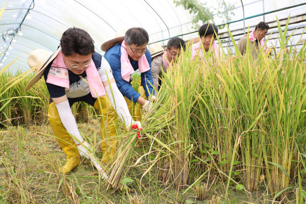 경기 이천시가 18일 오전 11시 호법면 안평3리 뜰에서 '2019년 전국 첫 벼베기' 행사를 개최했다. 이날 행사는 엄태준 시장을 비롯해 관계자 등이 참여해 벼를 수확했다. 사진은 엄 시장(왼쪽)과 관계자들이 벼를 베는 모습. (사진제공=이천시청)