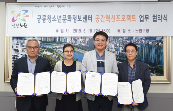 노원구는 18일 구청장실에서 BTS(Be Tween Space) 추진단과 ‘공릉청소년문화정보센터 공간혁신프로젝트’ 업무협약을 체결했다. 사진은 협약식에서 오승록 구청장(오른쪽 두 번째)과 관계자들이 기념촬영을 하는 모습. (사진제공=노원구청)